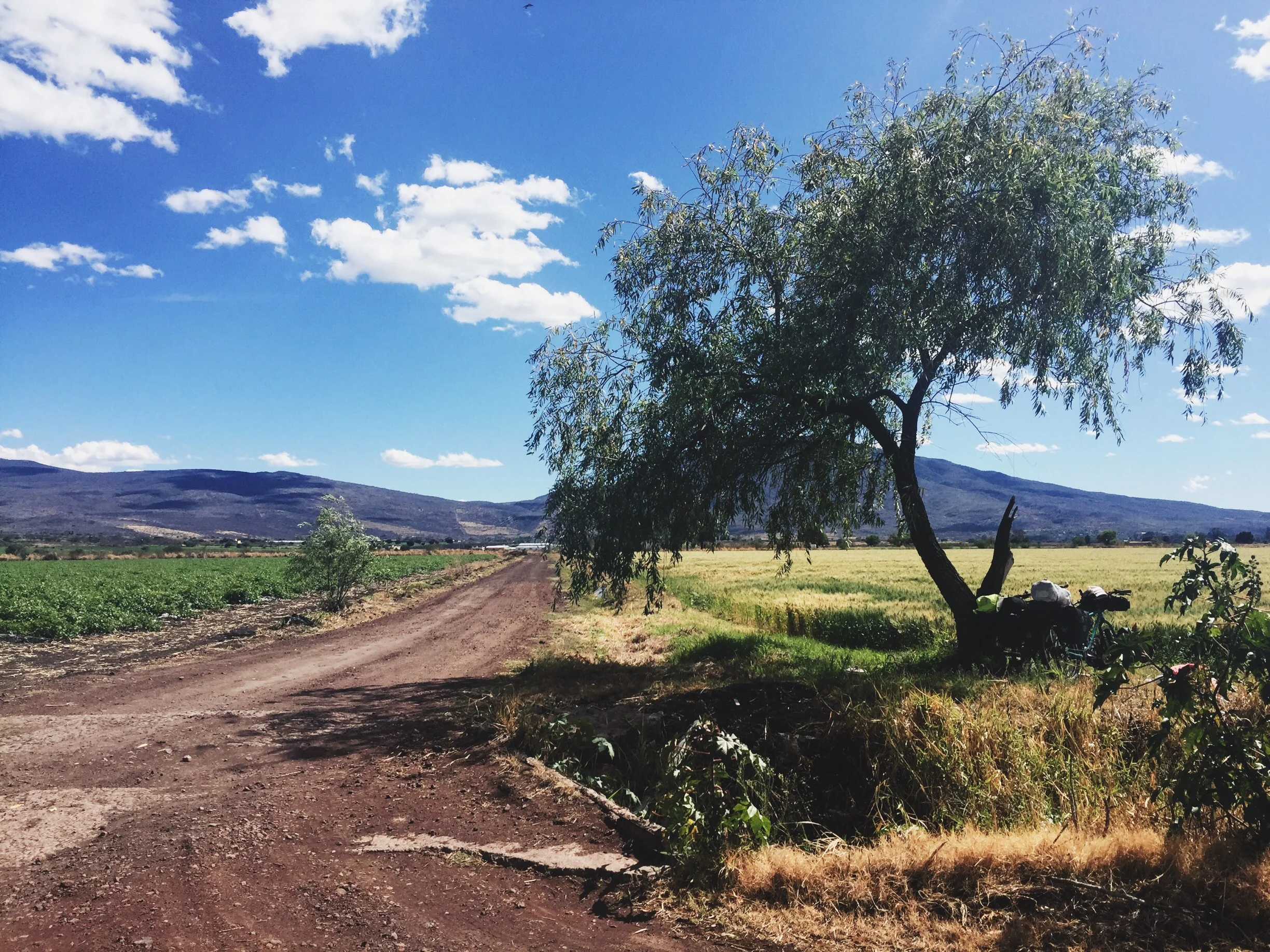 We decided to begin our journey out of Yurécuaro on dirt roads, navigating through rural farm land before linking up with the autopista. The ride took longer than expected – all day – but it was incredibly quiet, the land dotted with wheat and vegetable fields. Overall the terrain was flat which made it a nice, mellow ride. Dirt roads require a lot more physical effort than smooth pavement, but these quiet, tranquil backroads make the extra time more than worth it. We talked a lot about transforming our touring set-ups (saddlebags on our bikes and riding pavement) to do more bikepacking (ditch the saddlebags and center all the weight on our bikes to do dirt roads). It will be a process and we will have to shed a lot more weight, but we both know we are carrying things that we are not using on a regular basis. Poco a poco, as they say here in Mexico – little by little. For lunch, we stopped beside a wheat field and took shade under a tree. We whipped up a quick meal of guacamole & salad with tostadas and took a short siesta. Only two or three cars passed in the hour we were stopped! We absolutely love these quiet little roads and hope to do more of them.